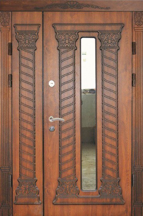 Поскольку в большинстве случаев устанавливаемые на входе в коттедж двустворчатые двери являются еще и предметом интерьера, украшающим здание, их дизайну предается особое значение. Эти двери, как правило, отделываются атмосферостойким МДФ, натуральным шпоном, массивом. Эффектно на таких дверях смотрится витражный узор, применение ковки, зеркальных элементов. Вариантов декора входной двустворчатой двери масса, тут все зависит от пожеланий заказчика.
